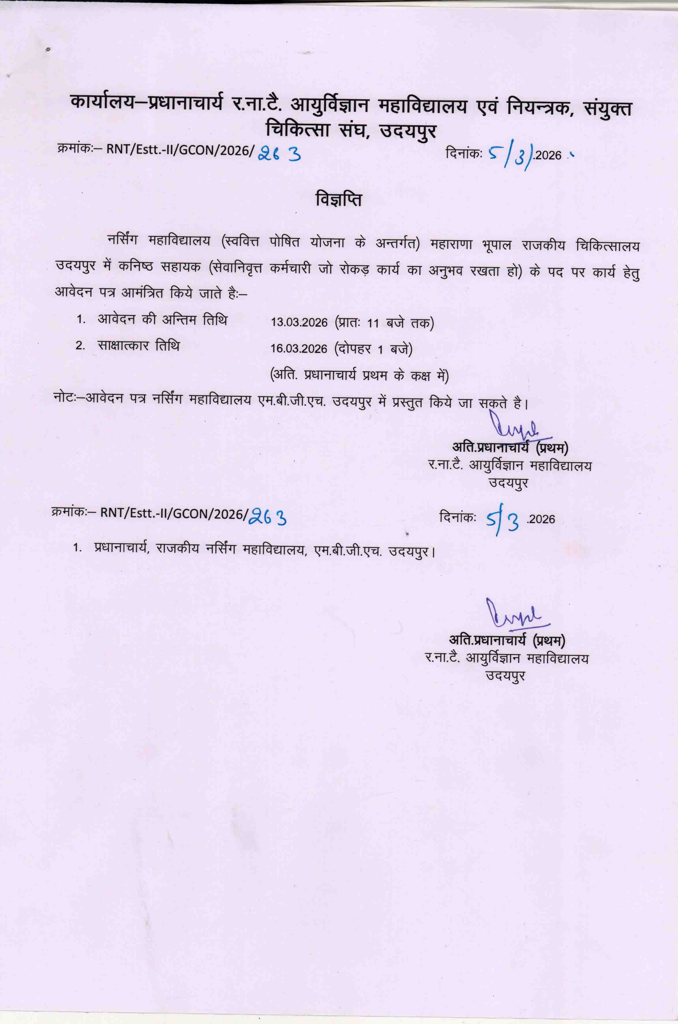 Advertisment for post of Junior Assistent